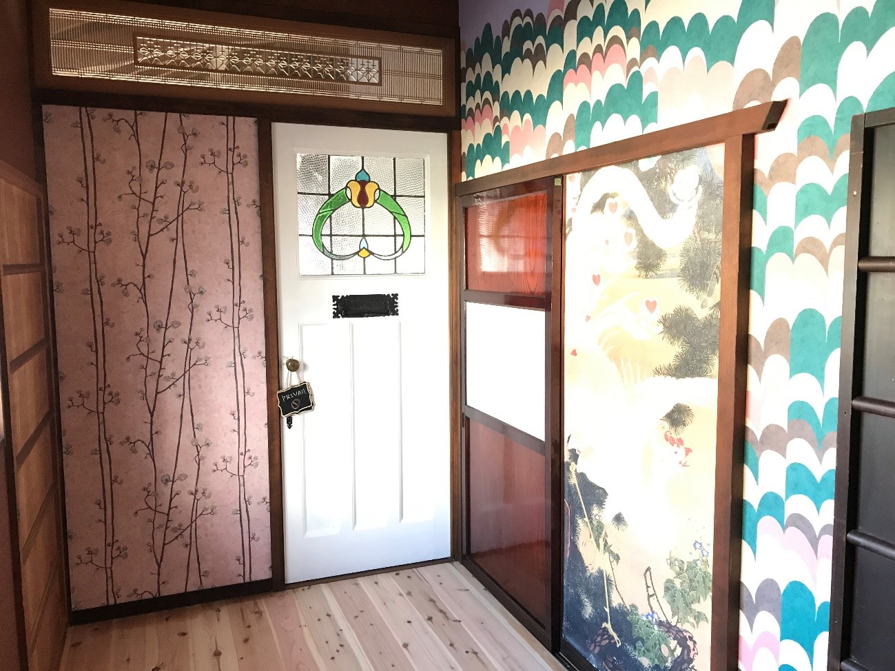 保育園でも目にしそうな色鮮やかな壁紙は、竹久夢二「宵待草」のデザイン。